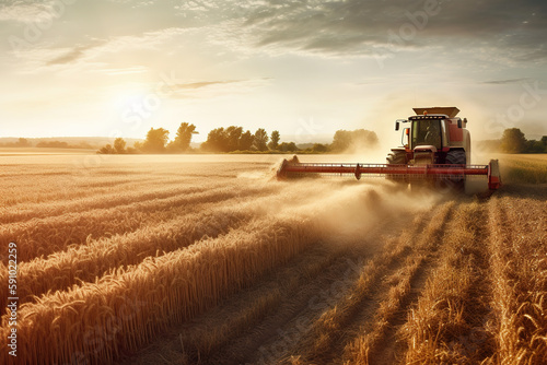 Fototapeta premium Farm themed image, showcasing a tractor collecting wheat in the field. Generative AI