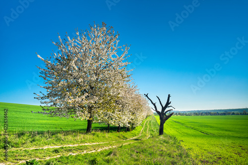 © AVTG, Fototapeta premium Farm track through green fields with cherry trees in bloom under blue sky in spring