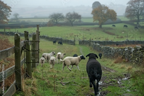 © Photock Agency, Fototapeta premium Farmer and his loyal dog working together to herd sheep in the highlands.