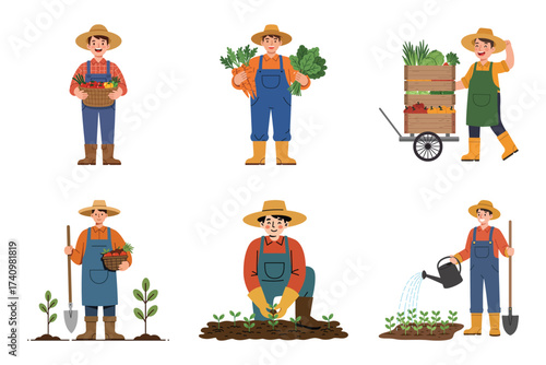 © Sunnn, Obraz premium Farmer character set showing planting, watering, and harvesting fresh produce