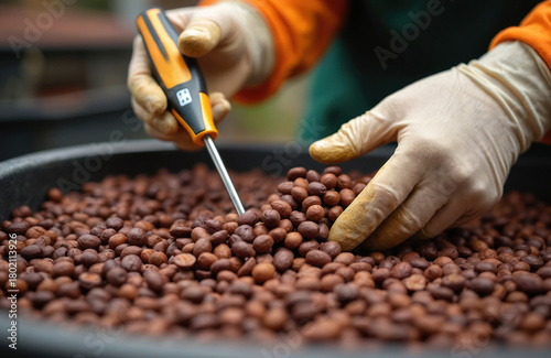 © miss irine, Obraz premium Farmer checks temperature of fermenting cocoa beans with digital probe. Hands in gloves sort raw seeds for chocolate production. Quality control of cacao farm produce.