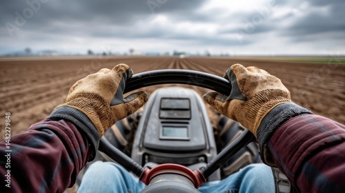 © Netsai, Obraz premium Farmer drives tractor, across plowed field, under cloudy sky, hands on steering wheel.