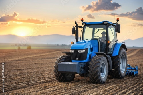 Obraz premium Farmer Driving Tractor at Sunset