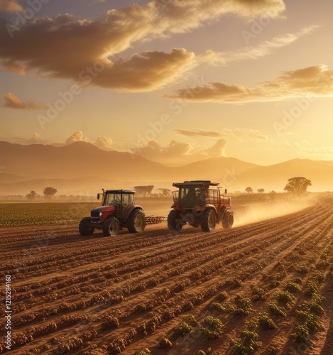 © Chanchai, Fototapeta premium Farmer harvesting coffee beans from large fields with a tractor near a golden sunset , field, tractor