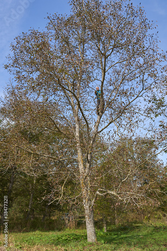 © Xalanx, Obraz premium Farmer harvesting walnuts