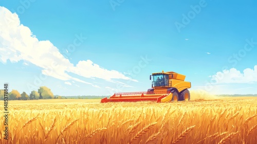© aan, Obraz premium Farmer harvesting wheat with a combine in golden fields under a clear blue sky.