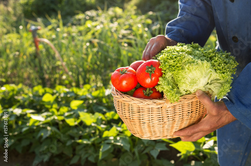 Fototapeta premium farmer holding basket with fresh organic vegetables