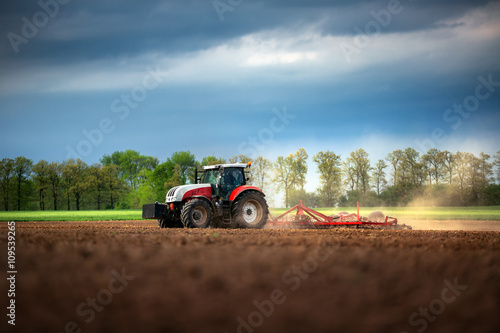 © ValentinValkov, Fototapeta premium Farmer in tractor preparing land with seedbed cultivator