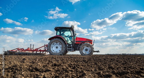 © oticki, Naklejka premium Farmer in tractor preparing land with seedbed cultivator
