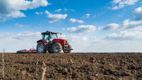 © oticki, Naklejka premium Farmer in tractor preparing land with seedbed cultivator