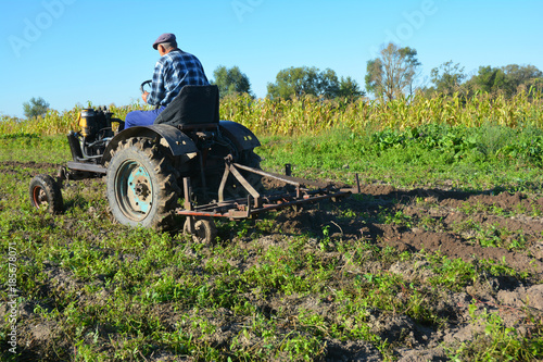 © bildlove, Obraz premium Farmer on old handmade tractor plowing. Farmer Tractor.