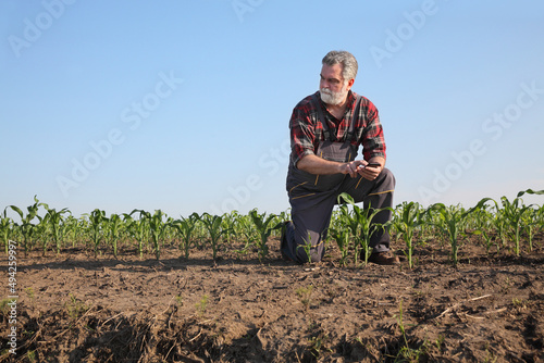 © sima, Fototapeta premium Farmer or agronomist inspecting quality of corn plants in field and typing to mobile phone