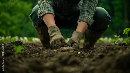 © ABIDZAR ALFAREZ, Fototapeta premium Farmer planting potatoes in field