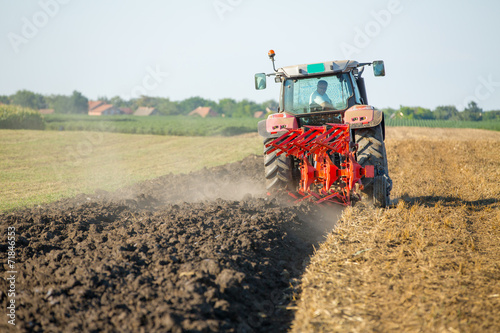 © oticki, Fototapeta premium Farmer plowing stubble field with red tractor