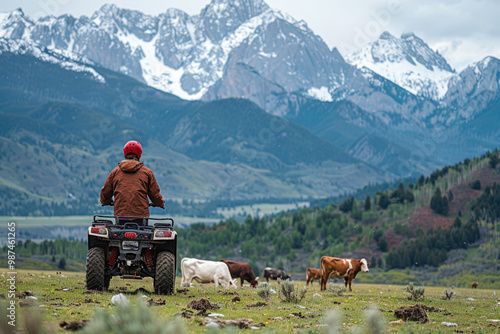 © Michael, Obraz premium Farmer riding quad bike checking cattle herd in mountain valley