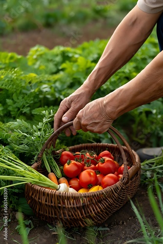 © Khadiza, Fototapeta premium Farmer s hands harvesting fresh vegetables in a wicker basket