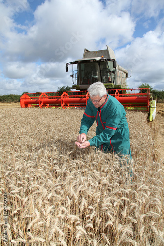© goodluz, Obraz premium Farmer standing in wheat field during harvest season