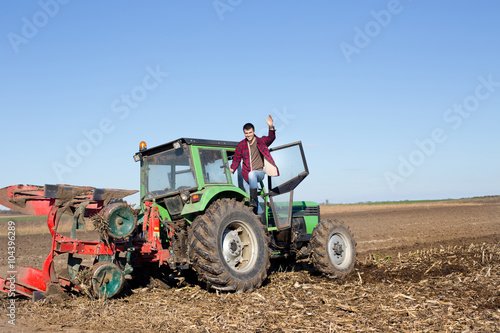 © Budimir Jevtic, Obraz premium Farmer standing on the tractor