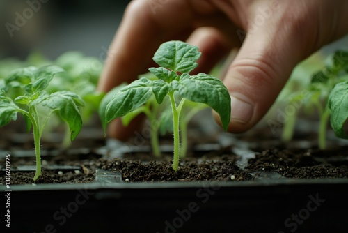 Fototapeta premium Farmer taking care of small tomato seedlings growing in seed tray