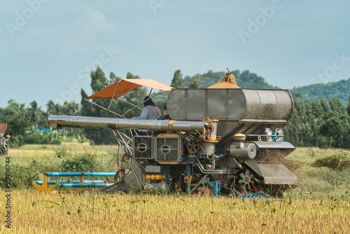 © Mumemories, Obraz premium Farmer using combine harvester working the rice in farmland