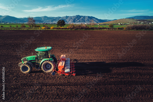 © ValentinValkov, Naklejka premium Farmer with tractor seeding crops at field