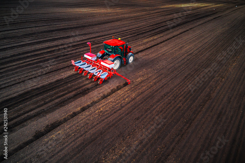 Obraz premium Farmer with tractor seeding crops at field, aerial drone view