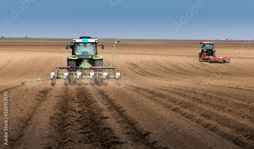 © Dusan Kostic, Obraz premium Farmer with tractor seeding sowing crops at agricultural field