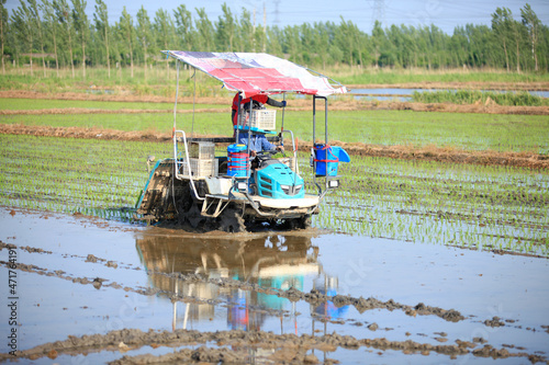 © zhengzaishanchu, Fototapeta premium Farmers planting rice in field by using rice planting machine.