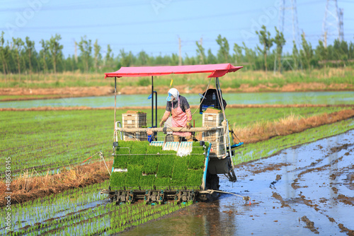 © zhengzaishanchu, Fototapeta premium Farmers planting rice in field by using rice planting machine.