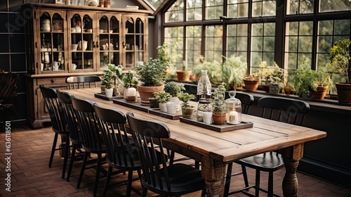 Naklejka premium Farmhouse Dining Room: Rustic Charm & Vintage Decor Generative AI