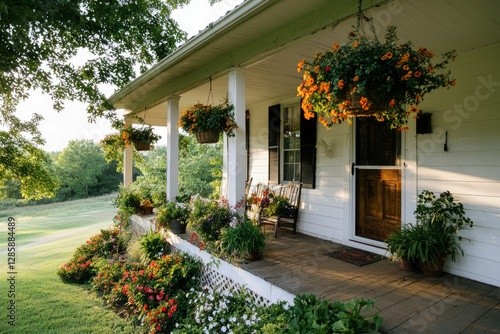 Naklejka premium Farmhouse porch with flowers at sunrise, ideal for real estate or lifestyle