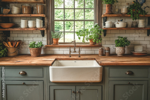 © Abdimanop, Fototapeta premium Farmhouse sink under window, shelves above.
