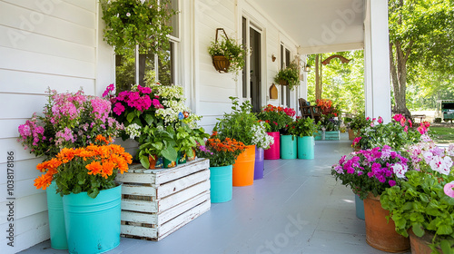 © Iis, Fototapeta premium Farmhouse veranda, DIY planters, vintage sign