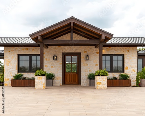 © Creator88, Obraz premium Farmhouse wine bar with stone and wood exterior, decorative planters, and pergola roof