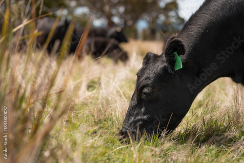 © Phoebe, Fototapeta premium farming in tasmania australia. livestock in a meadow, sustainable carbon neutral farming being practiced. regenerative raised cows in a field