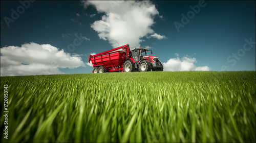 Fototapeta premium Farming tractor captured from ground angle with clouds overhead