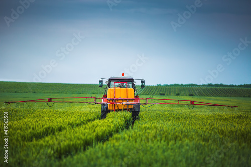 © ValentinValkov, Fototapeta premium Farming tractor plowing and spraying on field