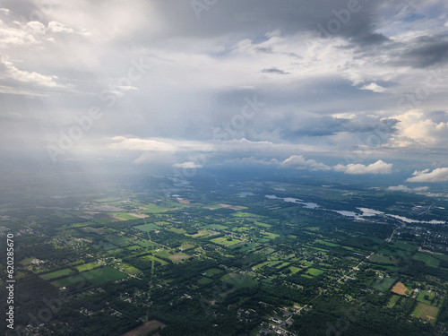 Fototapeta premium farmland from above lit by sunshine through clouds