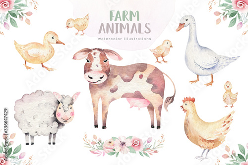 © kris_art, Naklejka premium farms animal set mill. Cute domestic pets watercolor illustration. horse and goose. ranchp pig design with goat. rooster chicken and sheep, cow.