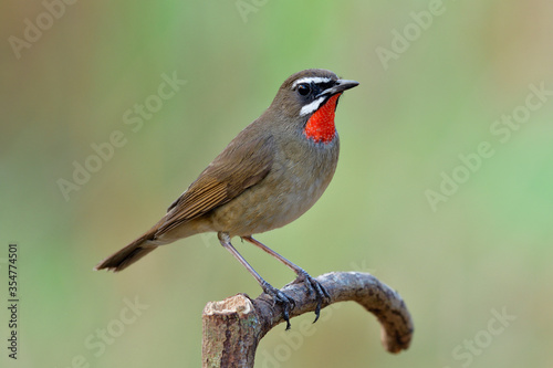© prin79, Fototapeta premium Fascinated pale brown bird with bright red feathers on ites neck perching on wooden stick calling for its mate, Siberian rubythroat (Calliope calliope)