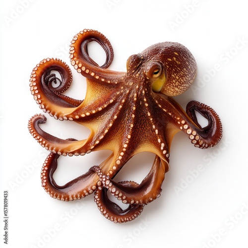 © Caspernik, Fototapeta premium Fascinating reddish-brown octopus with curled tentacles displayed against white background, showcasing detailed suction cups and textured skin in marine biology specimen photography