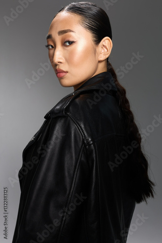© SHOTPRIME STUDIO, Fototapeta premium Fashion asian woman black leather jacket posing for camera side glance portrait of stylish asian woman in black leather jacket, looking off to the side
