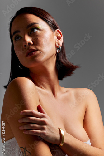 © Nadia L/peopleimages.com, Obraz premium Fashion, beauty and face of Asian woman in studio for makeup, wellness and creative cosmetics. Art, healthy skin and person on gray shadow background for glamour aesthetic, body care and luxury