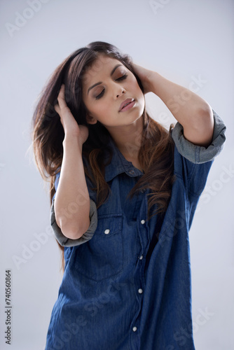 © Mapodile M./peopleimages.com, Obraz premium Fashion, denim and woman with confidence in studio in trendy clothes, casual style and cool outfit. Hair, sensual and isolated person with shirt for style, beauty and clothing on gray background