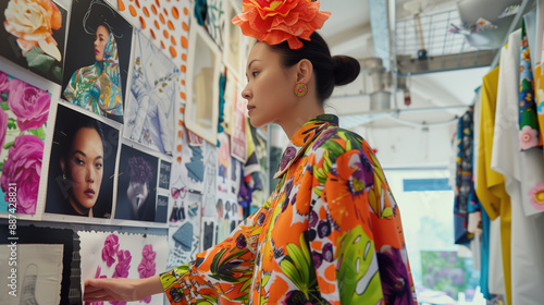 © Anna, Fototapeta premium Fashion designer in a colorful studio evaluating patterns and fabric samples on a wall. Textile design, creative process, fashion development, designer workspace, inspiration board.