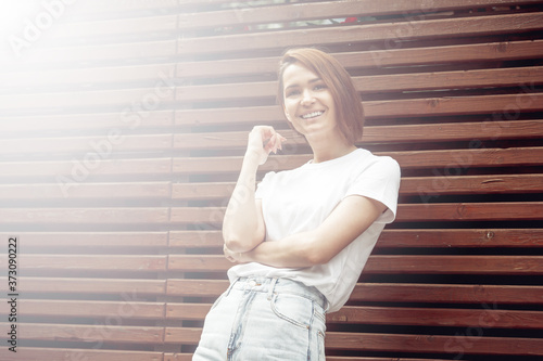 Fototapeta premium Fashion hipster cool girl relaxing on city street