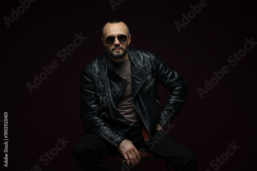 Obraz premium Fashion model. Handsome man in sunglasses on black background