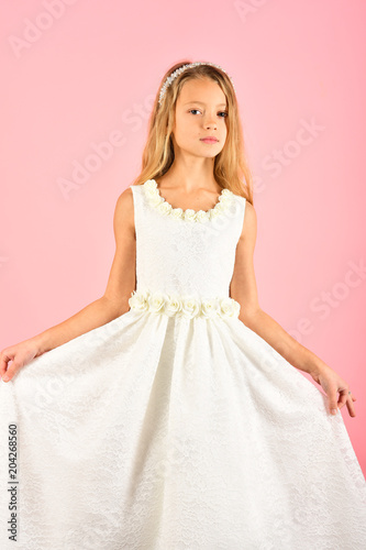 © Volodymyr, Fototapeta premium Fashion model on pink background, beauty. Child girl in stylish glamour dress, elegance. Look, hairdresser, makeup. Fashion and beauty, little princess. Little girl in fashionable dress, prom.