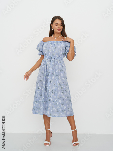 © Dmitry Tsvetkov, Fototapeta premium Fashion model showcases elegant blue dress in creative studio setting