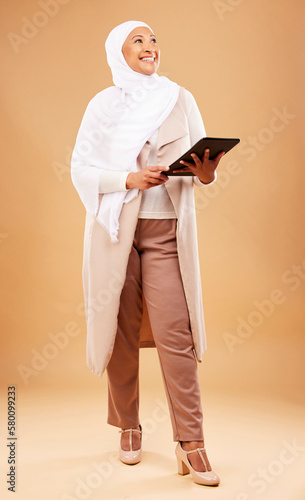 Fototapeta premium Fashion, muslim and woman with tablet in studio isolated on a brown...
